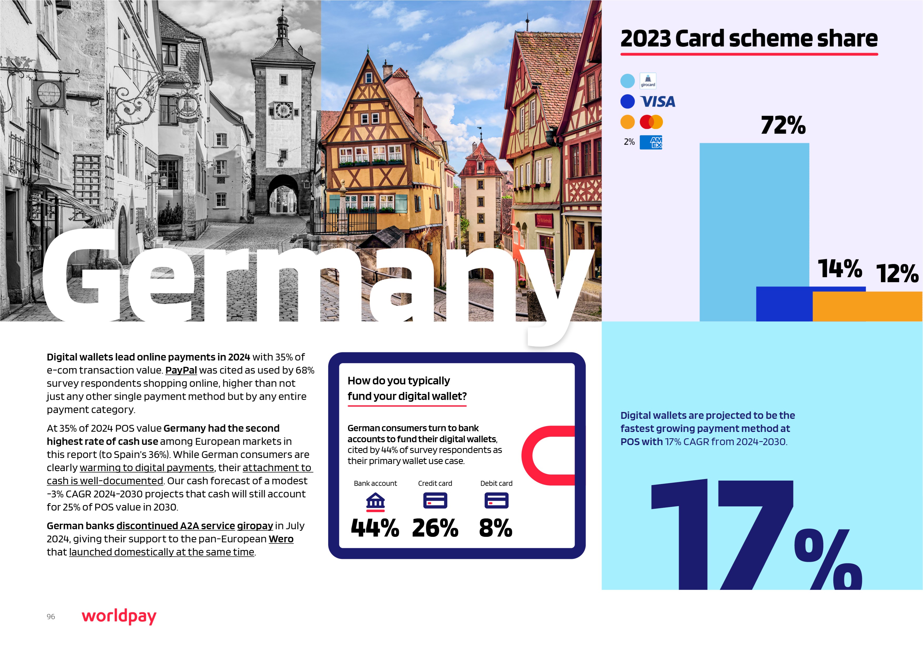 Digital wallets are the top choice when shopping online. European consumers typically fund their wallets directly via their bank account, which was the leader in nine of Europe’s 14 markets in GPR.